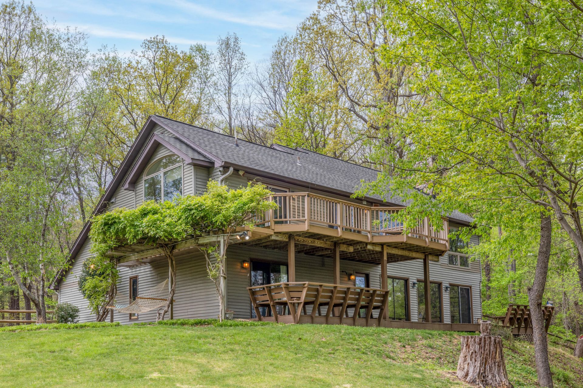 Welcome to your private South County oasis! This 2.85 acre retreat achieves the perfect balance of seclusion & convenience. The light filled interior features an open flow & a cozy wood-burning fireplace, perfect for chilly mountain evenings. Enjoy stunning winter views and a lush ''treehouse'' feel all summer long. The spacious kitchen features granite and opens to the deck. The primary suite offers dual closets, a lovely ensuite, & private deck access. The finished walk-out lower level adds a 4th bedroom, family room, and flex space ~ ideal for guests! Outside, the expansive double deck overlooks a massive, fully fenced backyard. With an oversized 2-car garage and easy access to the Blue Ridge Parkway and top-rated schools, this property offers the best of Roanoke living.